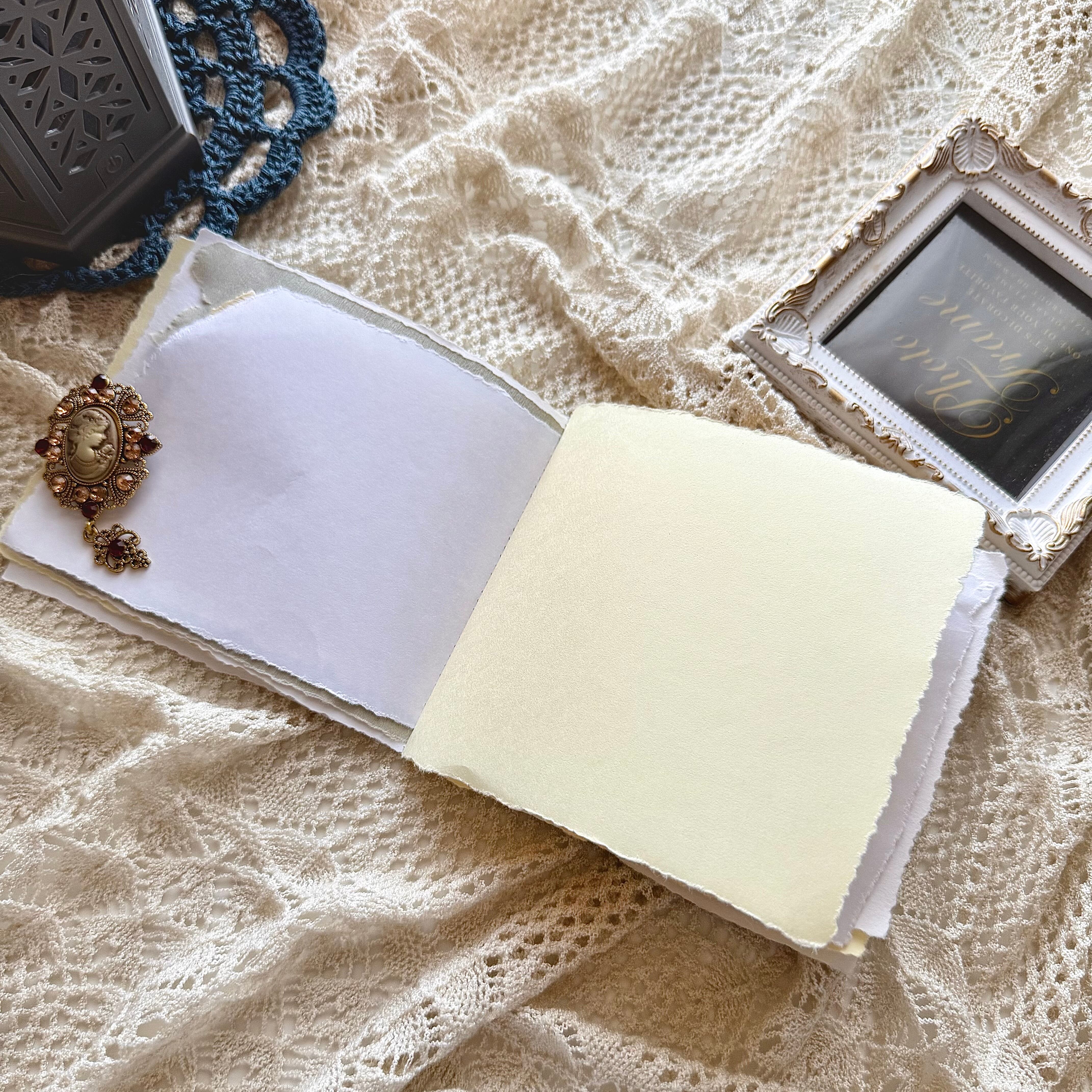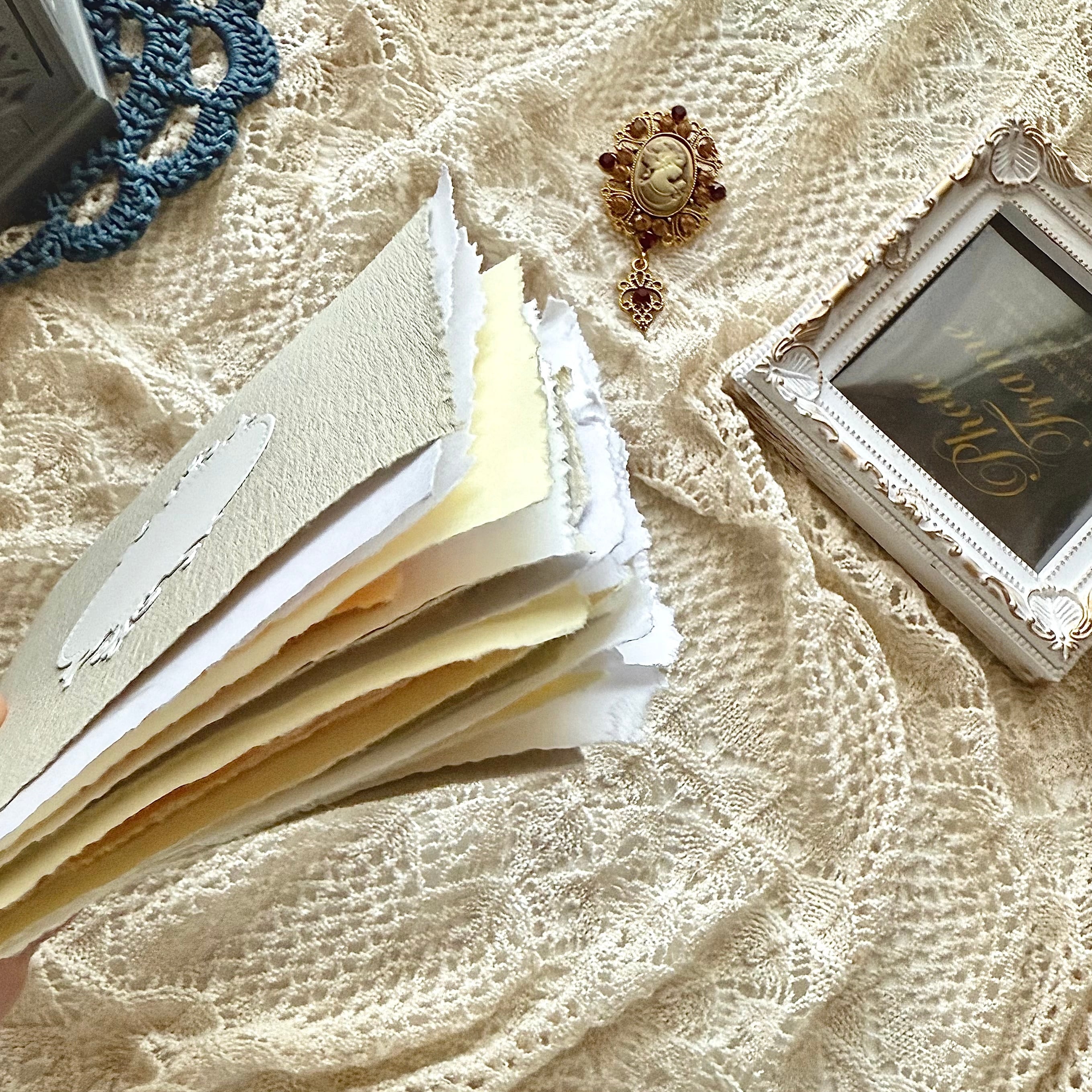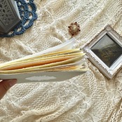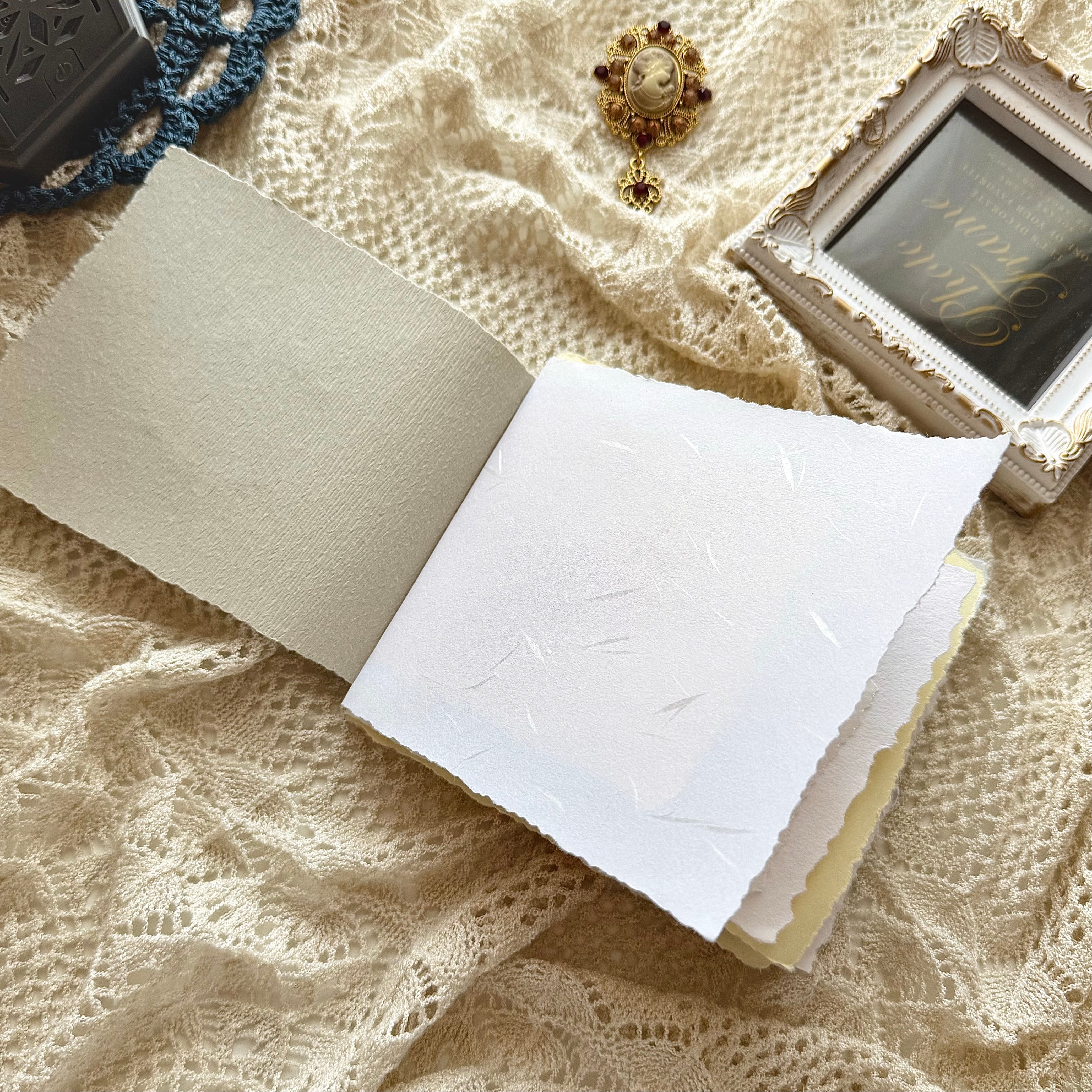 ページは和紙をメインに特殊紙、トレーシングペーパーの様に透ける素材で模様が入ったものなど数種類をランダムで綴じてます。