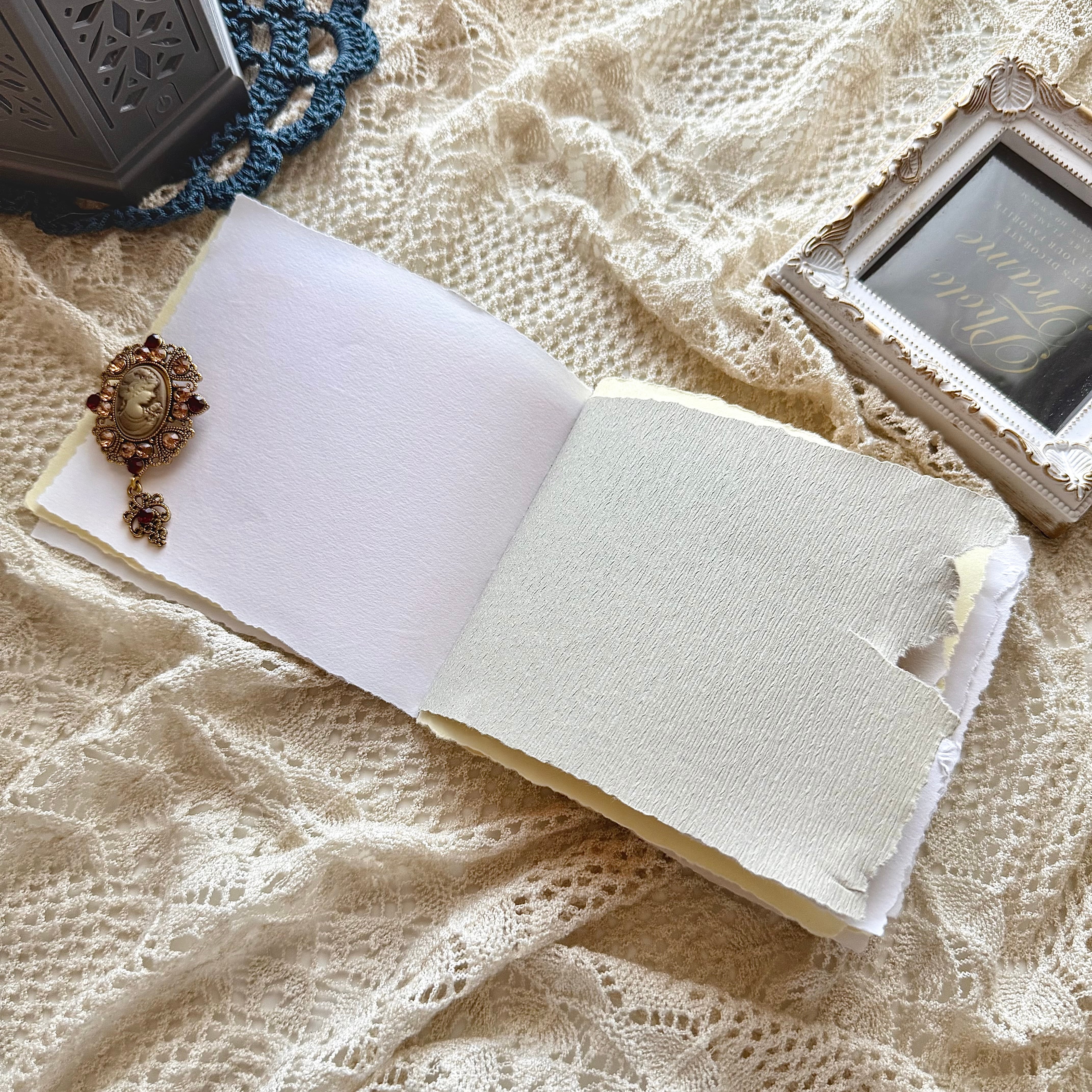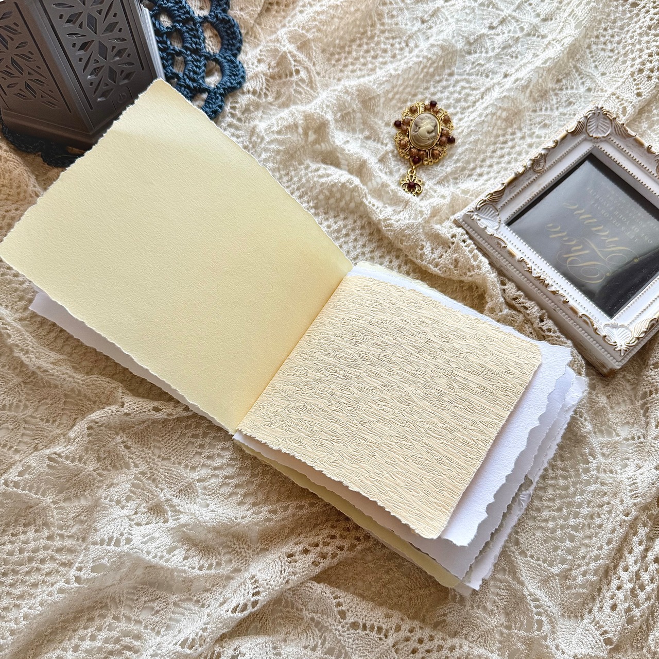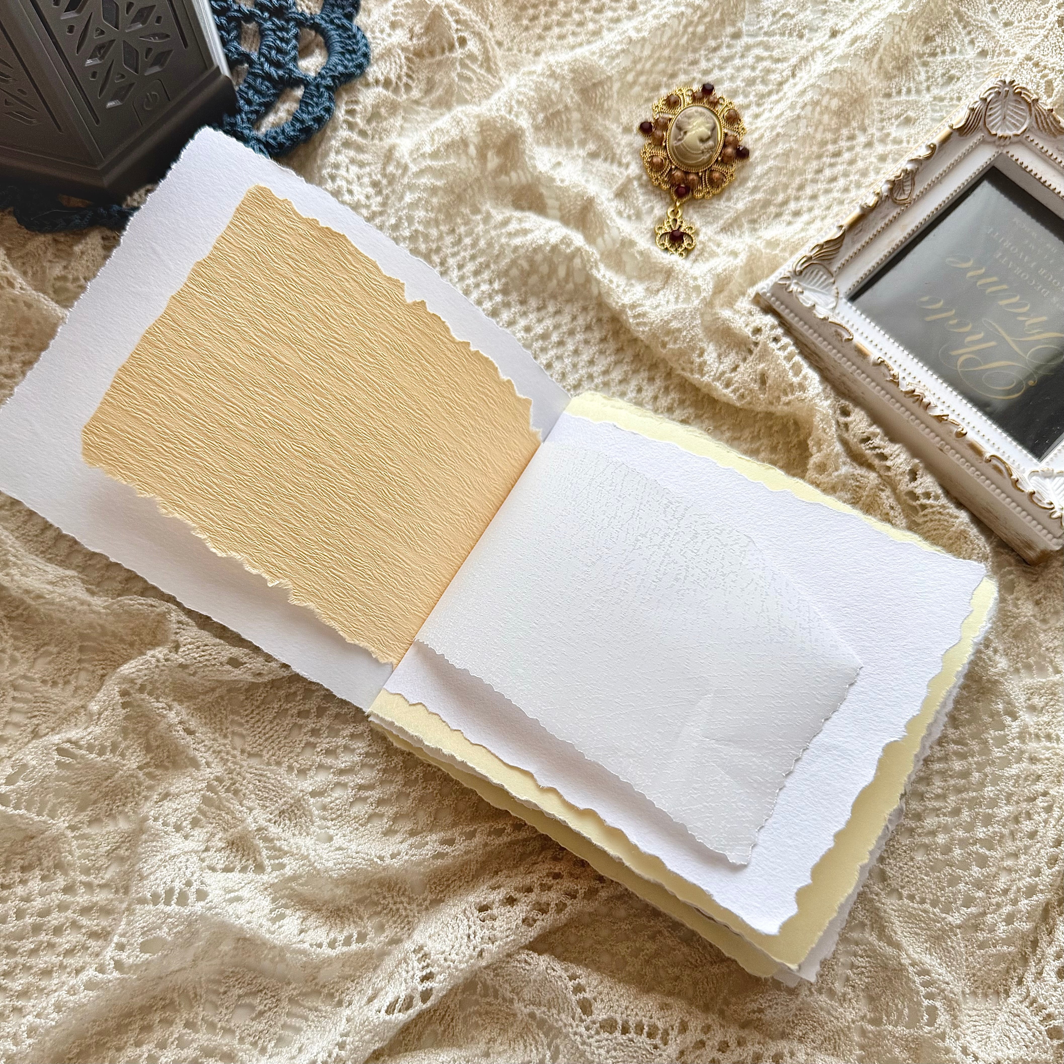 ページは和紙をメインに特殊紙、トレーシングペーパーの様に透ける素材で模様が入ったものなど数種類をランダムで綴じてます。