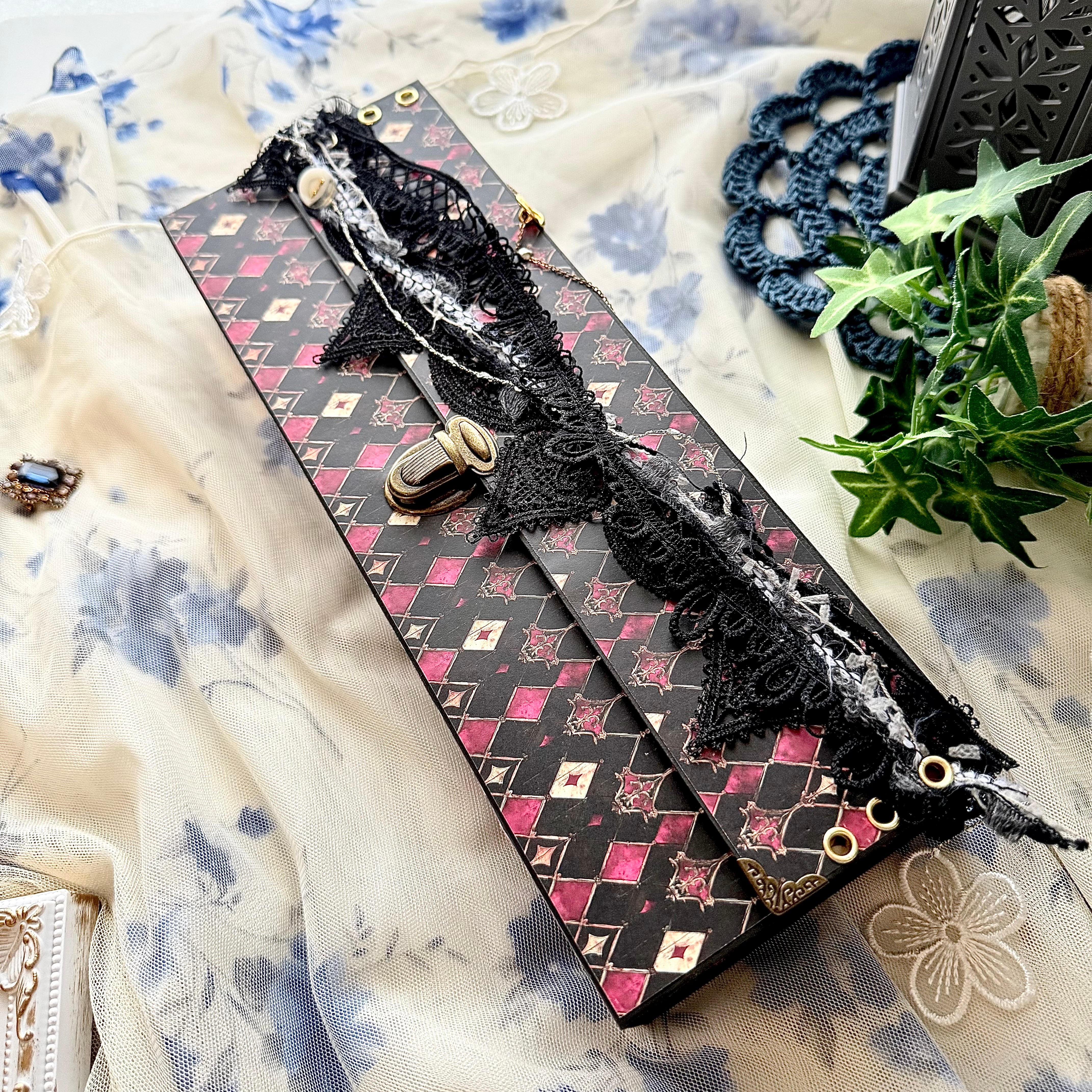 外装にレース、アンティークボタン、金具などで装飾してあります。
